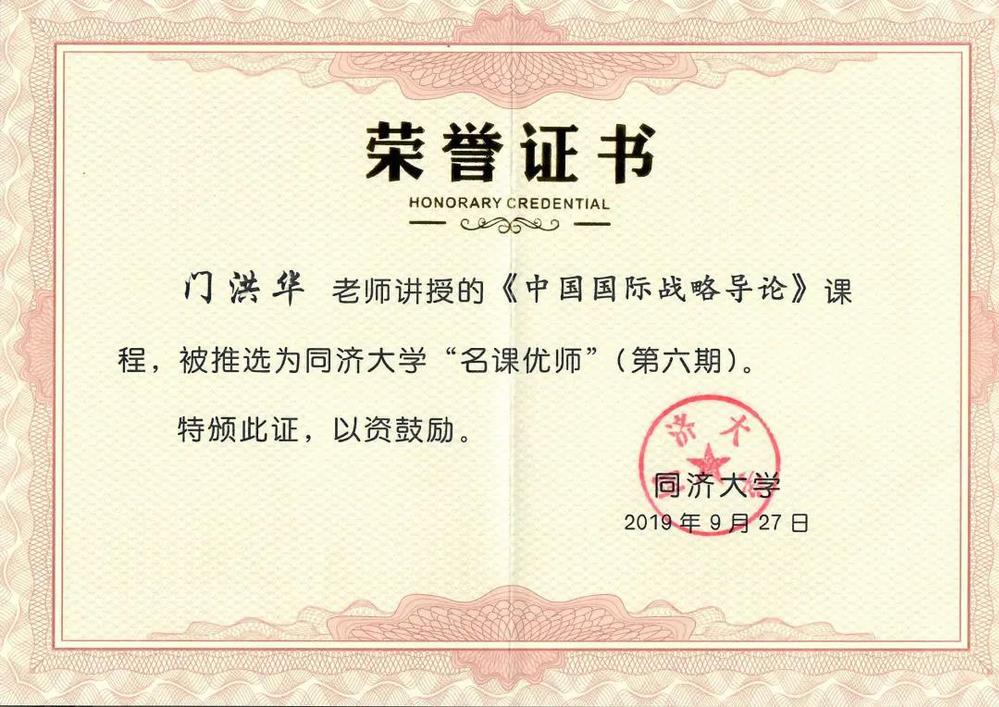 在此次评选中,同济大学同济特聘教授、华体买球(中国)官方有限公司院长、中国战略研究院院长门洪华教授主讲的《中国国际战略导论》荣获上海高等学校一流本科课程(线下课程)。