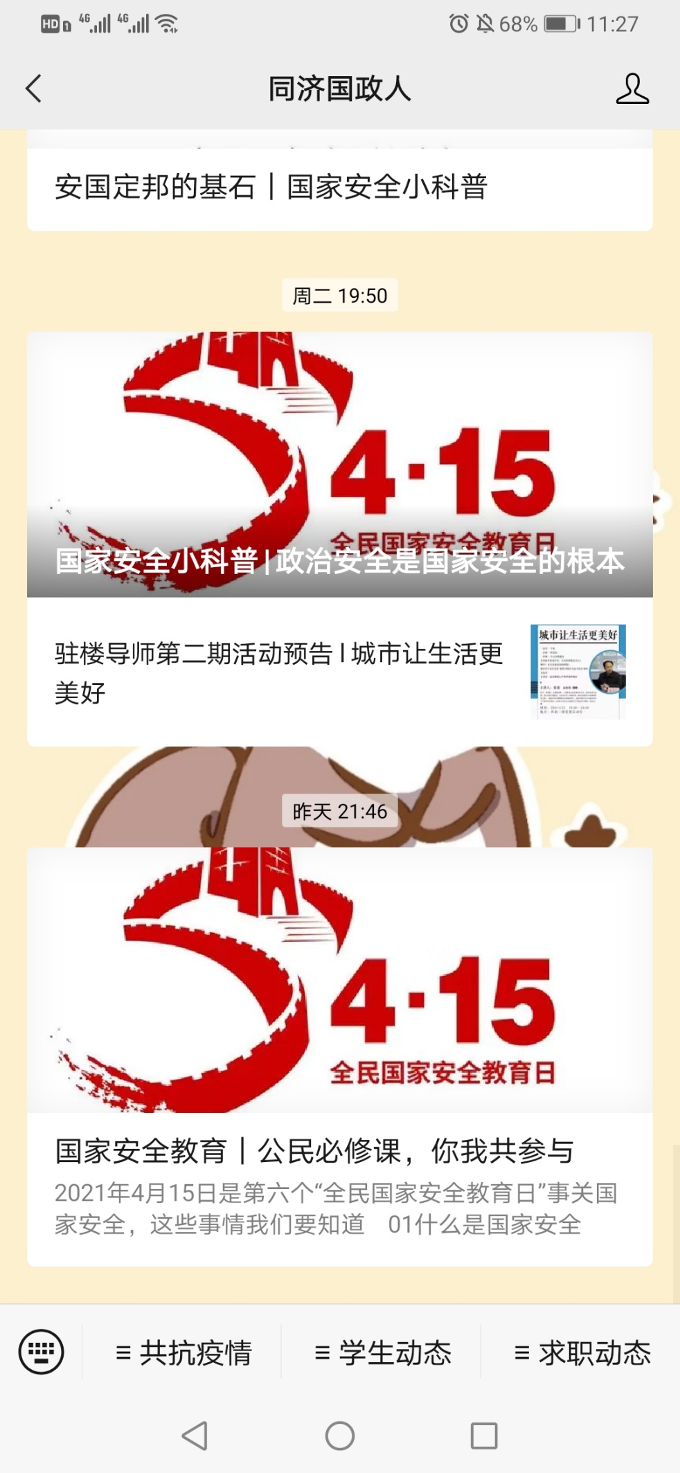 为进一步营造校园内国家安全教育宣传的浓厚氛围,以及增强学生的国家安全意识,4月12日至4月14日,“同济国政人”公众号平台开辟了“国家安全教育日主题宣传教育专栏”,通过线上文章推送的方式向同学们展开国家安全知识科普和宣传教育。