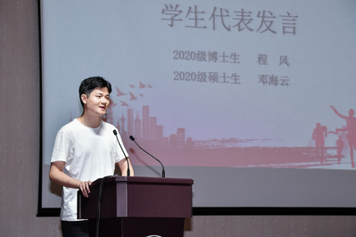 在新生代表发言的环节中,2020级博士新生程风分享了他的经历与感悟。从毕业到迎新,他学会了告别,同时也学会了成长,他告诉我们人生的新篇章要坚定从容,砥砺前行。他认为,经世治国,尽才情于社稷;恭身行道,付青春于黎民,这是中国士人的初心,也是每一个国政学院学生应有的情怀。
