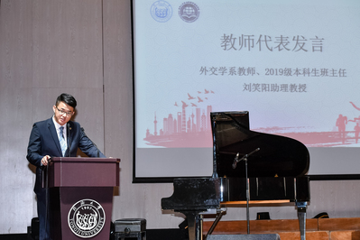 外交学系教师、2019级本科生班主任刘笑阳助理教授作为教师代表发言。刘老师向大家分享了关于快乐的法则:一是要心中有爱,包括付出与理解;二是肩上有责,以精英的标准要求自己,应当是同学们坚持不懈的责任;三是腹中有墨,以学习所带来的知识和阅历作为基础,才能以最美好的方式表达爱。刘老师指出,学习不仅是为了让自己懂得更多,也是要让自己相信的更少,用简约而坚定的信念去指导所知所行,仰观宇宙之大,俯察品类之盛,这就是简单的力量。最后刘老师引经据典,期待同学们在卓越的国政学院里成就卓越的人生。