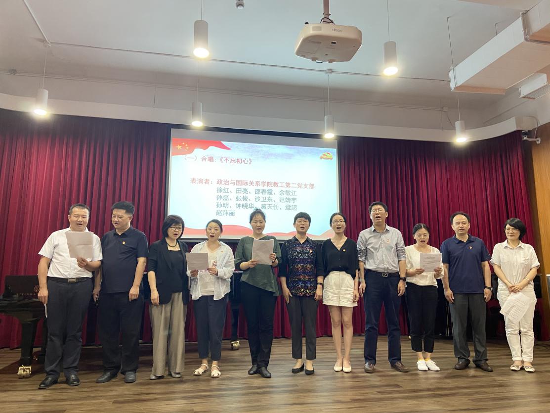 艺传学院教工一支部表演了诗朗诵、电影片段表演、小合唱。值得一提的是,所有教工党员均是跨专业表演。声乐、表演、指挥的老师朗诵诗歌,演奏乐器的老师表演话剧,教表演、钢琴的老师上台唱歌,教音乐理论的老师弹钢琴等,既体现了支部党员教师的文艺才华,也充分表达了他们以“业余者”的身份与以社会科学研究为重心的国政学院共同开展文艺表演的深厚情谊。今年是左联五烈士牺牲九十周年,诗朗诵《别了,哥哥》道出了殷夫在兄弟间的手足情和革命信仰之间做出的选择。小话剧《风声》片断将文艺联谊活动推向了高潮,舞台上的三位表演者自然、投入,革命者的勇敢无畏、牺牲自我的精神深深感染了在座的全体党员。剧场的魅力在那一刻喷薄而出,演员、观众、党员、教师,所有的身份似乎转换成了同一种身份,置身于党旗、党史和无数先烈志士所创造的精神的光韵里。