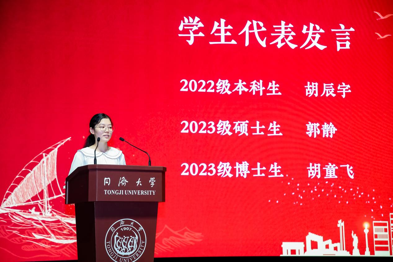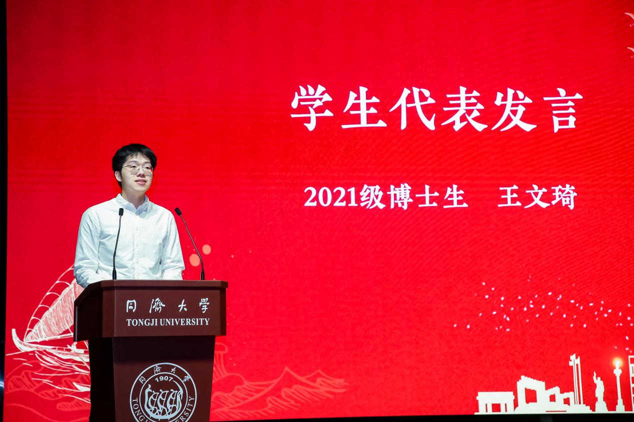 2021级博士研究生王文琦回顾了自己在同济国政的种种收获,指出“力学笃行”、“同舟共济”、“胸怀天下”乃是国政人应当拥有的品德素养。中国正处于时代的十字路口,而我们青年学子也正处于人生发展的十字路口,他祝愿各位新生在同济国政的时光,可以让大家找到对自己、对社会、对国家满意的人生答卷,让年华绽放出最绚丽的青春之花。