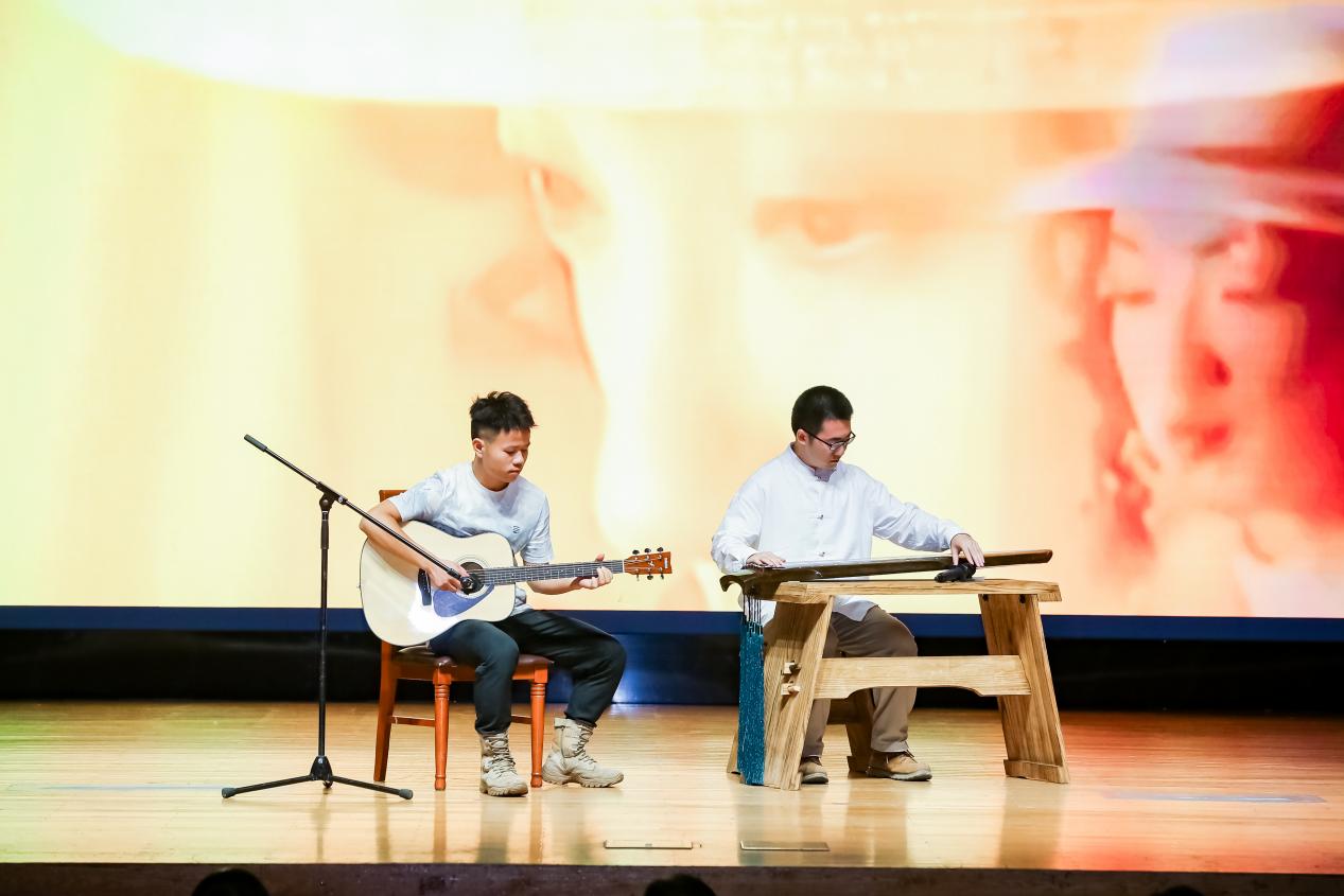 冯骏鹏、蒙万继两位同学带来的乐器合奏《千千阙歌》,悦耳的琴音里是我们熟悉的音律,让人深在浮世中,却有皓月当空,清风徐徐之感。两位同学精彩的演绎让古琴与吉他的配合和谐统一、相得益彰。