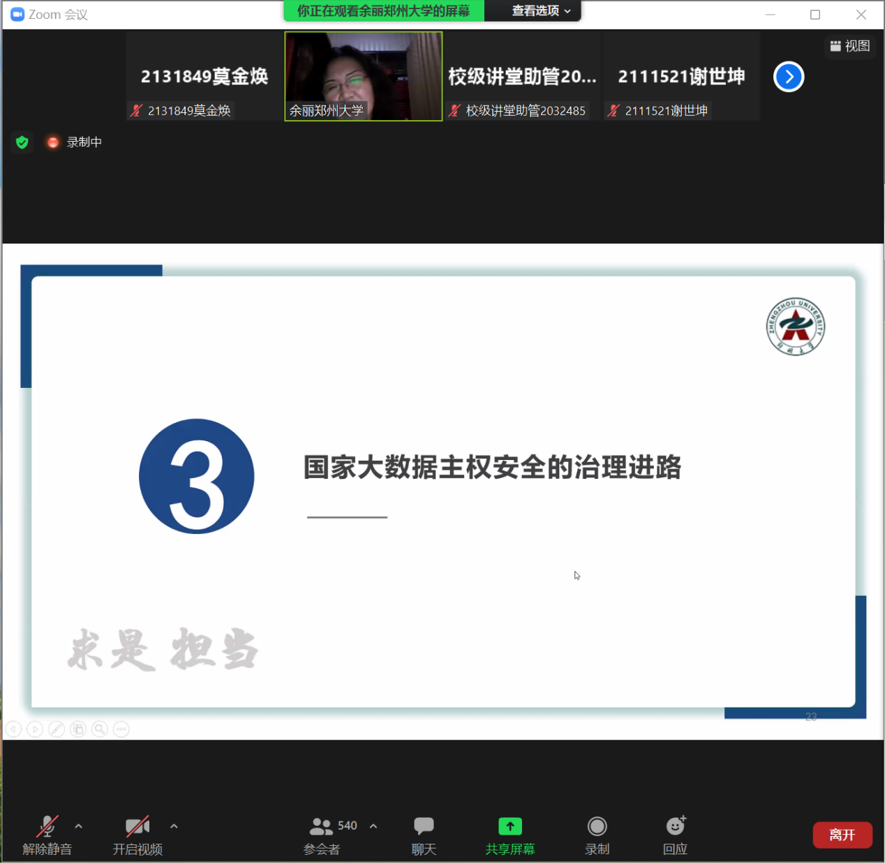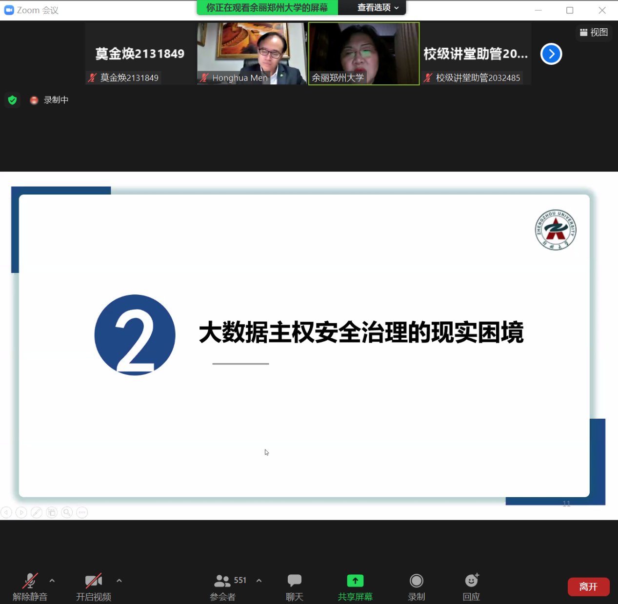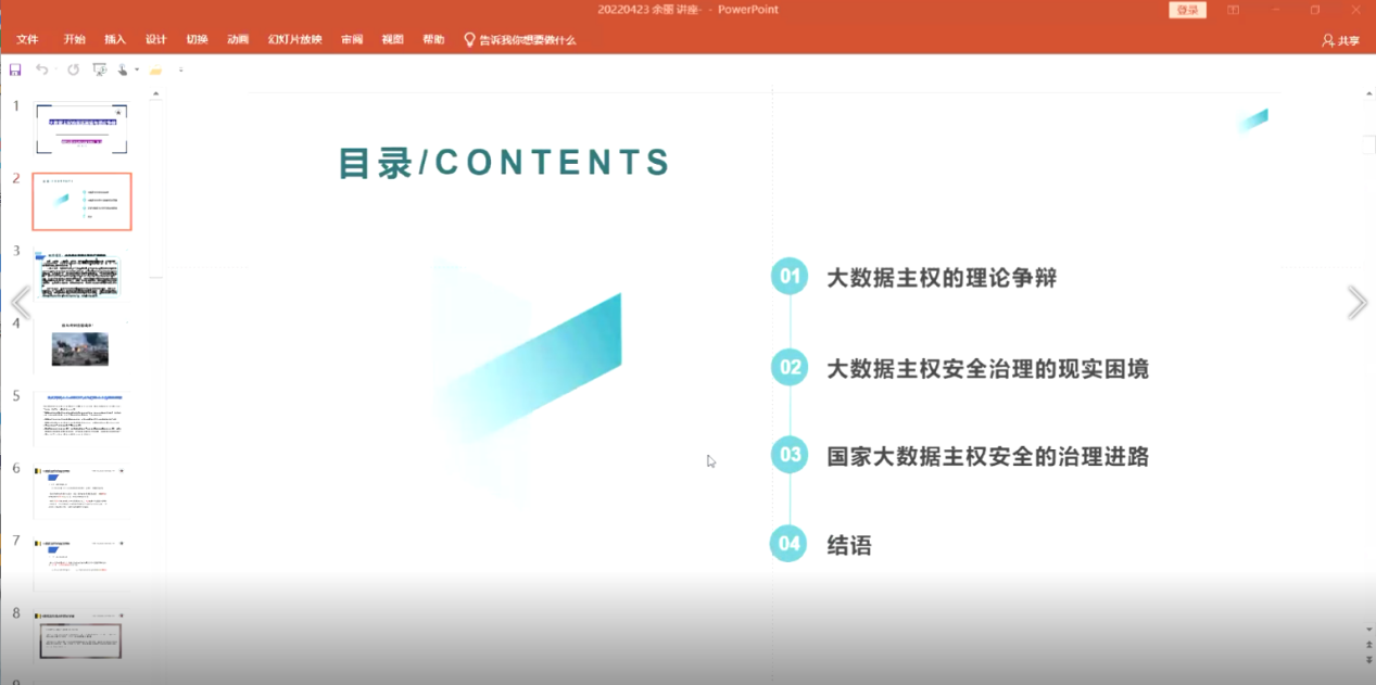 在本场讲座中,余丽教授从“大数据主权的理论争辩”“大数据主权安全治理的现实困境”“国家大数据主权安全的治理进路”等三个方面进行了讲解。