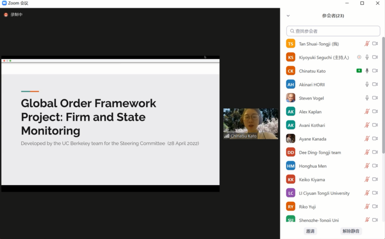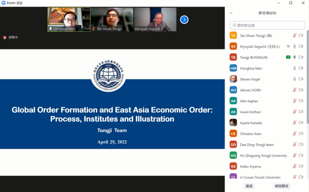 On April 29, 2022, invited by Mr. Kiyoyuki Seguchi, Research Director of Canon Institute for Global Studies (CIGS), nearly 20 teachers, students and scholars from the Institute for China & World Studies / the School of Political Science & International Relations of Tongji University, the University of Tokyo, and the University of California, Berkeley (UC Berkeley), participated in an online international symposium on "Global Governance and Reconstruction of World Order".