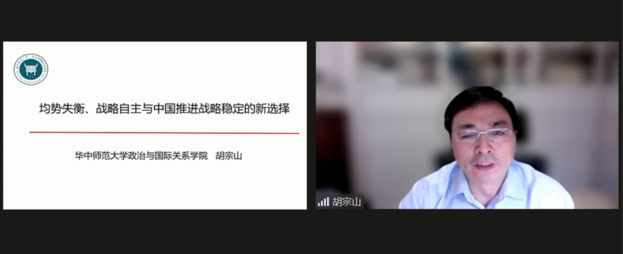 Prof. Hu Zongshan, Dean of the School of Politics and International Relations of Central China Normal University, spoke on the topic of "Imbalance of Power, Strategic Autonomy, and China's New Options for Promoting Strategic Stability" from three aspects, i.e. "The International Pattern and Global Balance of Power", "A New Round of Global Imbalance of Power after the Russia-Ukraine Conflict", and "China's Strategic Autonomy and New Options for Promoting Strategic Stability".