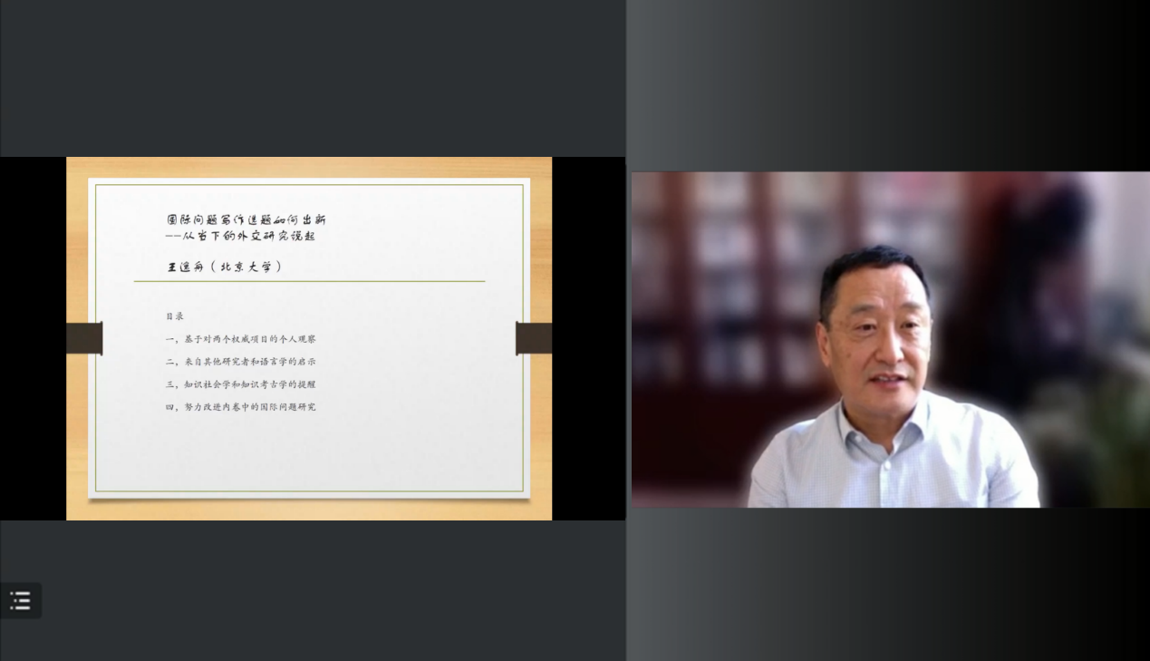 Secondly, Prof. Wang talked about the enlightenment from other research scholars and linguistics for research and writing on international issues. Taking the research of Prof. Zhuang Liwei and Dr. Jin Lei as examples, Prof. Wang emphasized the necessity to expand the existing research agenda and enhance the cultural consciousness of "unity in diversity". On this basis, he continued to discuss how international studies should draw on other disciplines such as ecology, medicine, and linguistics, with the aim of opening up the mind to present the beauty of international studies and the vagaries of diplomacy.