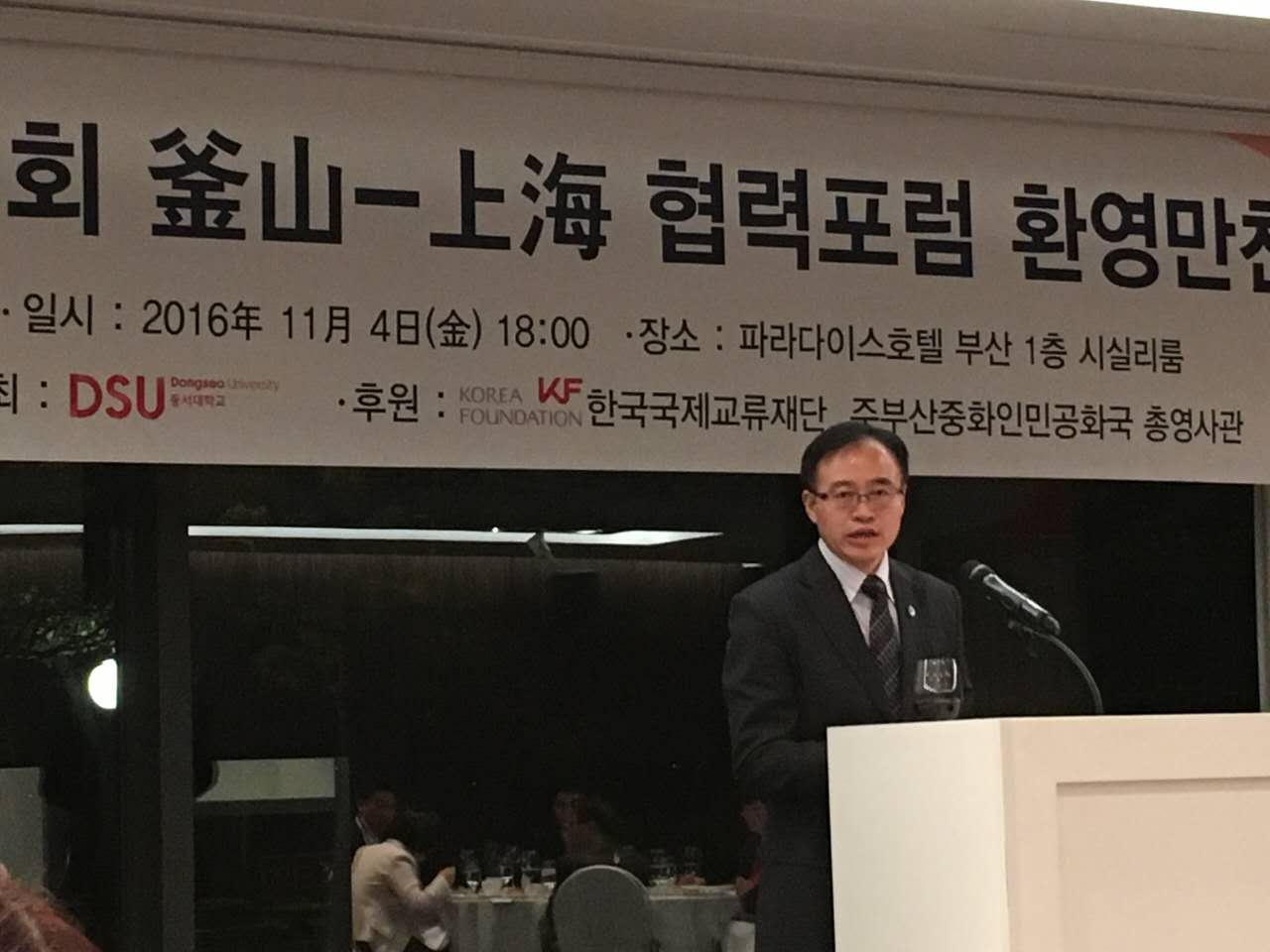 On November 5, 2016, the 1st Shanghai-Busan Cooperation Forum was officially held in the Conference Hall of Paradise Hotel Busan, attended by more than 30 Chinese and Korean experts and scholars. Mr. Seo Byung-soo, Mayor of Busan, and Ms. Wu Yi, Deputy Consul-General of China in Busan delivered speeches to express congratulations.