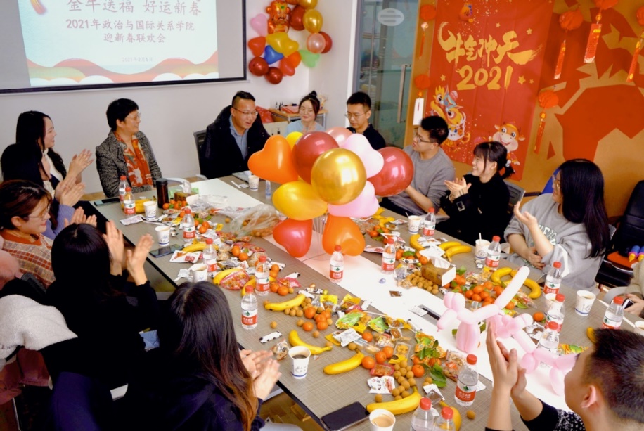 On the afternoon of February 6, 2021, Professor Xu Hong, Secretary of the Party Committee of the School of Political Science & International Relations (SPSIR), and Wu Xiaoli, an assistant for political and ideological work at SPSIR, gathered with the students staying at school in winter vacation in room 1401, Zhonghe Building, to celebrate the Spring Festival together.