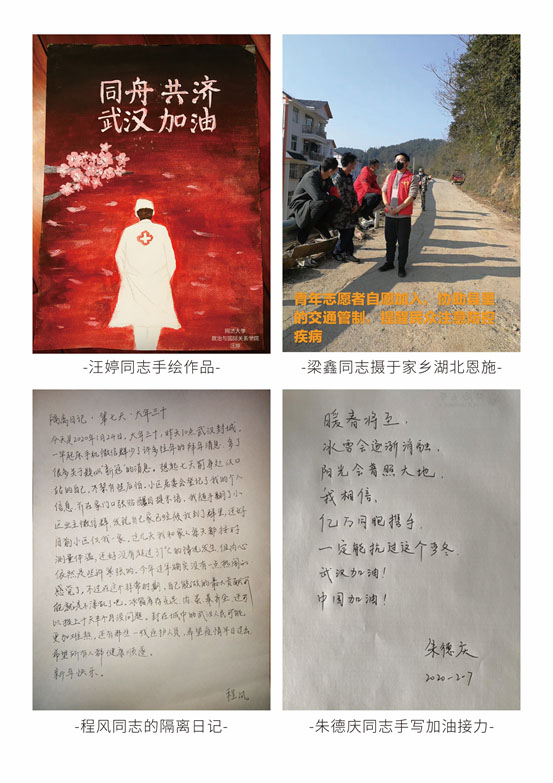 The first and third postgraduate Party branches of SPSIR conducted an online campaign to spread epidemic prevention knowledge and requirements. Members of the Party branches have given full play to their subjective initiative and creativity to express their gratitude and support to the frontline workers in Wuhan through hand-drawing, text and photos. Active applicants for Party membership also submitted their special thinking reports. Party members in the epicenter of Hubei wrote quarantine diaries to share the real life in the affected areas, and show the care and encouragement from the University and the School. They felt so lucky and happy to be a member of the big warm family of SPSIR. In particular, Comrade Yu Yanfang played an exemplary role to join the local volunteer team of Party members, trying to contribute a part to the victory over the virus in her hometown. In this special period, let us unite as one to overcome the pandemic as soon as possible.